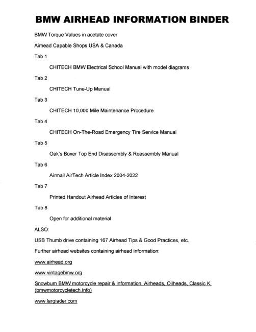 Whether you are a new airhead owner or have owned one for a period of time, this binder can help you keep any model airhead in good condition whie in your possession. The attached outline of the binder contents will provide you with proper techniques and values to service and maintain your airhead motorcycle. Now that the airhead knowlege individuals are aging out since the bikes themselves can be as old as 55 years, the loss of quality knowledge can be detrimental to an owner's enjoyment of their bike. As a former Certified BMW mechanic and shop owner, I have accumulated much quality information over the last 40 years and it is concentrated into this airhead binder. Every airhead owner needs to assemble their own personal binder as one cannot remember all that goes into quality care of an airhead.