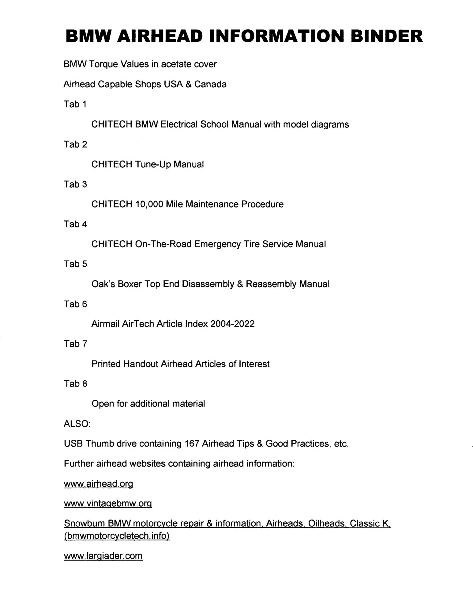 Whether you are a new airhead owner or have owned one for a period of time, this binder can help you keep any model airhead in good condition whie in your possession. The attached outline of the binder contents will provide you with proper techniques and values to service and maintain your airhead motorcycle. Now that the airhead knowlege individuals are aging out since the bikes themselves can be as old as 55 years, the loss of quality knowledge can be detrimental to an owner's enjoyment of their bike. As a former Certified BMW mechanic and shop owner, I have accumulated much quality information over the last 40 years and it is concentrated into this airhead binder. Every airhead owner needs to assemble their own personal binder as one cannot remember all that goes into quality care of an airhead.