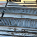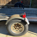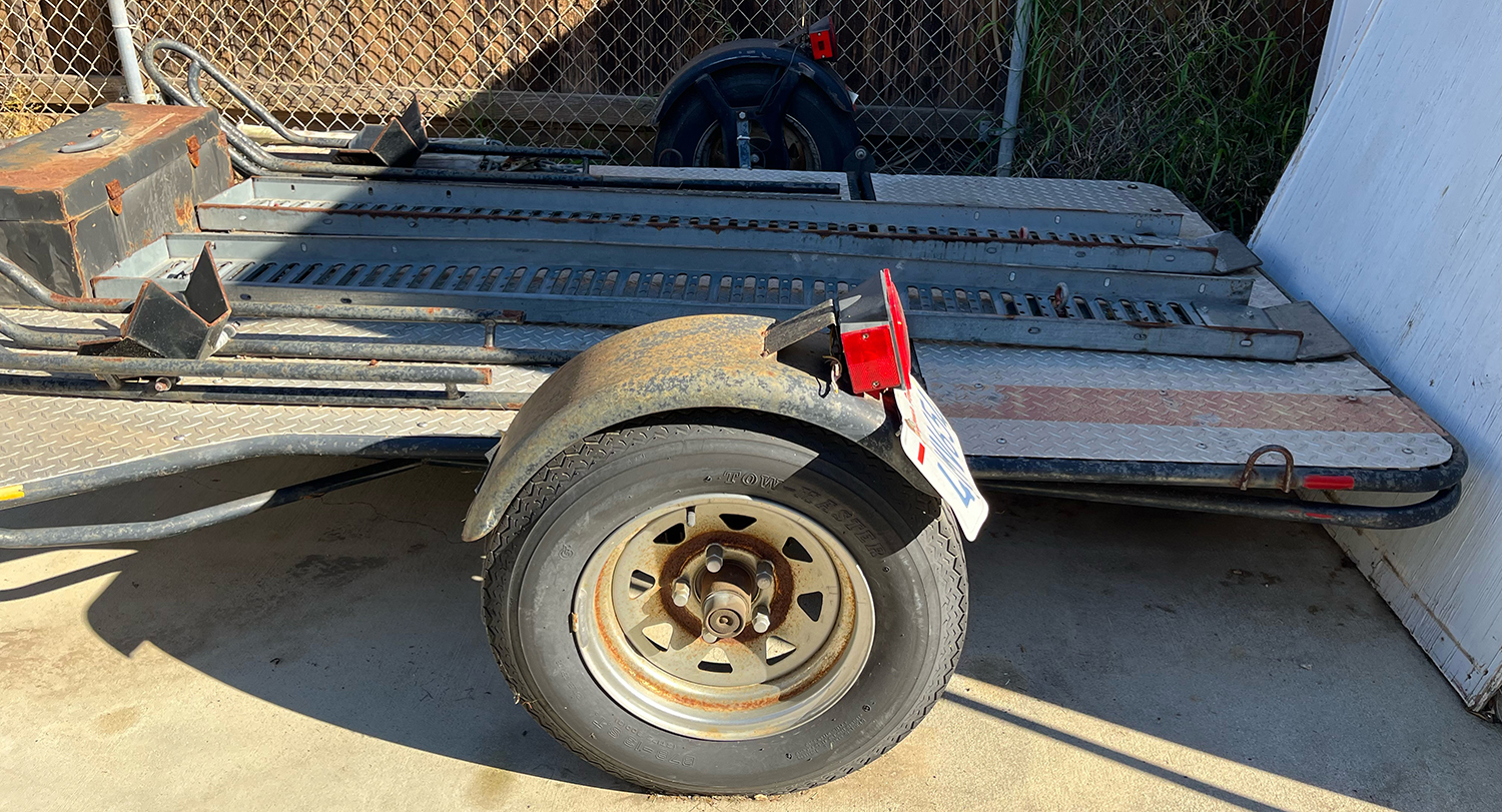 4. With the ramps off it, the piece to the right of the tire folds onto the trailer between the two tires, and then the whole thing can be stood up, therefore taking up less room for storage