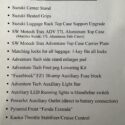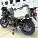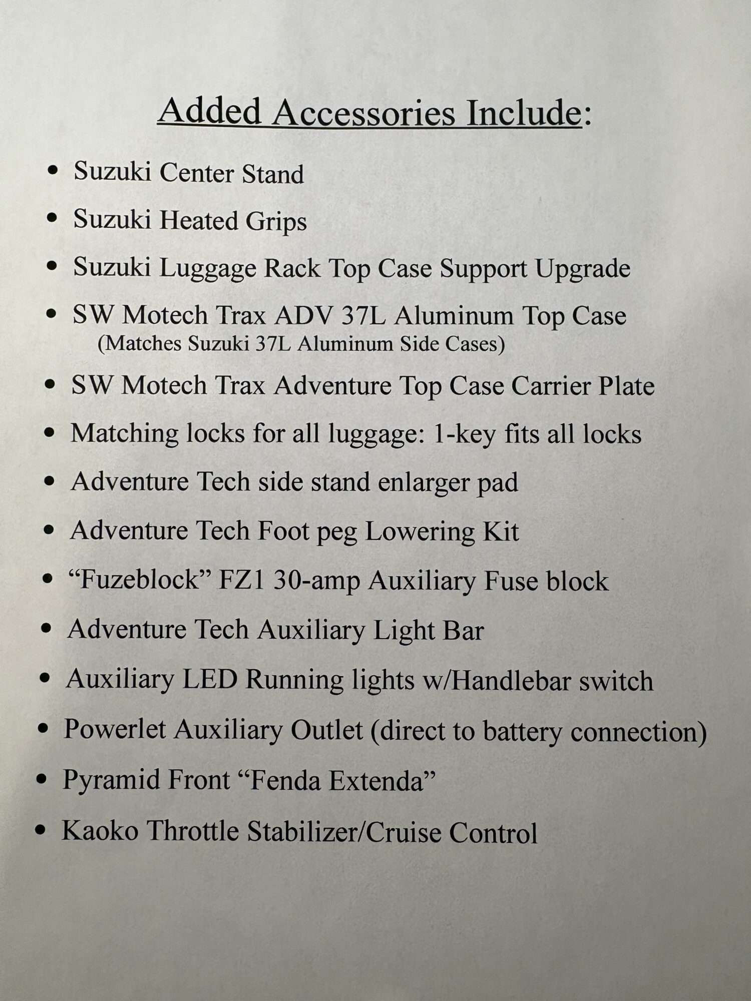 Added items include a Suzuki OEM Center-stand, Suzuki Heated Grips, Suzuki reinforced rear luggage rack, SW Motech Trax 37L Aluminum Top Box on an Adventure carrier plate (matches the side cases with all locks keyed alike for 1-key convenience). See list in photos for other included accessories.
