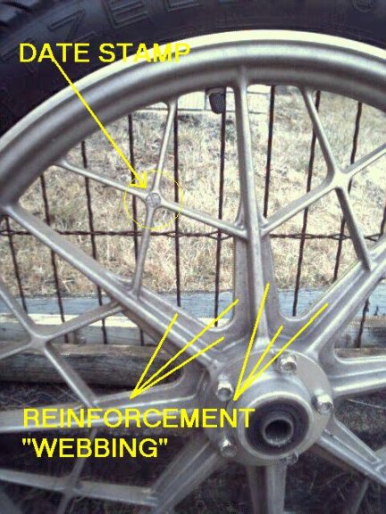 The ‘good’ wheels have support ribs between each main spoke & the hub at the hub area. By support ribs I mean of the MAIN SPOKES. This is from approximately the point where the X ribs intersect those main spokes about half way out to the rim from the center, very roughly, to the hub. The main spokes are slightly widened in their mid areas….like a duckfoot web….in other words, they are broadened at the center thickness, but not as thick as the spoke itself. The web that was added is more or less shaped like a U, if one includes the portion of the hub they are connected to. This is all VERY easy to see at a quick glance. DO NOT let that description confuse you, I have PHOTOS, below, that makes it very clear what I mean. Wheels with other numbers of main spokes have been reported….that is, both 8 & 10 spoke wheels have been recalled; but see the photos…. as only those withOUT the webbing at the hub are recalled!