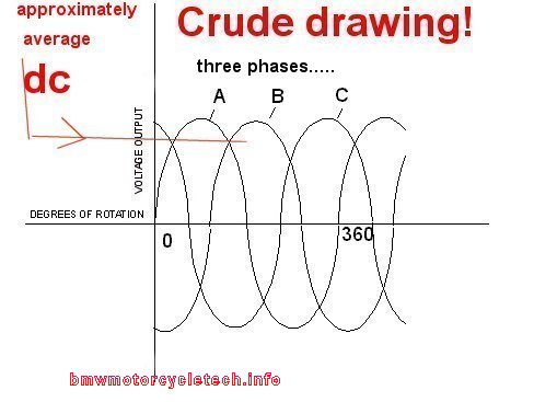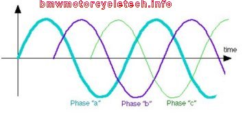 BMW elected to use in the Airheads a type of generator called an alternator. The name means that its output is alternating current. The output frequency (number of CYCLES per second, or Hz) varies with engine speed.