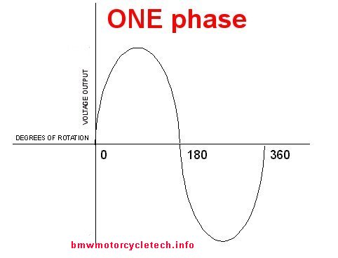The alternator does not produce just one sine wave output; but, for efficiency, is designed to have THREE….’THREE PHASES’. Let us call one cycle as being 360 degrees on a linear time chart. The alternator produces, via its three phases, overlapping outputs. Each phase is 120 degrees offset. Those waveforms are constantly rising and falling in sine-wave form. With overlapping waveforms at 120°, there is more constantly actual output…that is, much LESS time is at lower sine-wave levels. The result is more power. If you have one of the EnDuralast permanent magnet alternator conversions, that is a ONE phase alternator. It would be more efficient if it was 3 phases, but that would complicate them. One of the reasons the EnDuraLast PM system does not produce very much additional output over stock, and produces its output at lower rpm, is due to this one phase design.