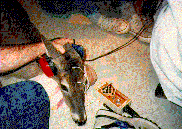 Although white-tailed deer (Odocoileus virginianus) vocalizations have been recorded and described, virtually nothing is known about “audition” or the range of hearing by deer and other ungulates. To address this need, I conducted some controlled experiments in collaboration with Dr. Jon Hunter at the College of Veterinary Medicine at Texas A&M University. Audiograms were determined for 5 bottle-raised adult white-tailed deer (3 males, 2 females). While anesthesticized, deer brainstem evoked potentials were recorded from the frontal sinus, vertex, and dorsal border of the zygomatic arch.