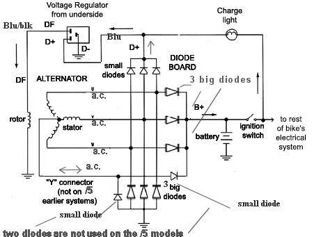 The following sketch originally came from http://www.thunderchild-design.com/images/charg1.gif. The sketch “was” similar, but not the same as Buchanan’s. I have considerably modified Thunderchild’s sketch, just below, with identifications of wire colors, small diodes, current flows, and /5 system information. The only items I have not put into this sketch are the Kill switch, and the later /5 system’s fuse in the charge light circuit. Arrows show direction of current flow.