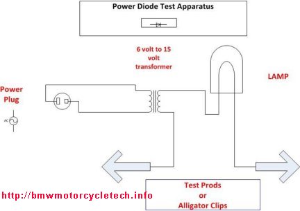 You can also make a two-in-one tester. Get a new run and brake lamp, such as the type 2257 or 2157, or 7528. These lamps have a TWO filaments, one is low powered (generally ~8 watts, maybe 3/4 of an ampere at most) for the run section; and 21 or 27 watts (roughly 2 amperes) for the high power brake section. The pins are offset, that is, staggered, so the lamp will plug into the socket (autoparts stores have sockets for them with wires) in only one direction. The high power section is OK to test the diode board big diodes, and the low power section is OK for testing the low power diodes in the diode board. You must identify the leads so you do not mix up the sections. You will have two wires from the lamp, plus the lamp shell wire. You use the lamp shell wire (make up a wire if not so equipped) and one or the other of the two lamp wires.