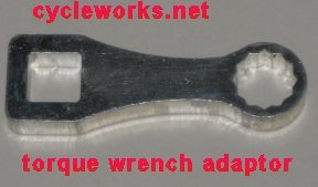 Dig into your tool drawer for a combination 10 mm wrench. That means it has a 10 mm 12 point box end and the other end is an open wrench. If you are lucky, you have a more rare wrench, that is 10 mm box at one end and 11 mm box at the other end. If the other end is a 10 mm open end, simply use that with the 3/8″ drive of the torque wrench, and do not let it slip out while in use. If you use that wrench as an adaptor with your torque-wrench, straight out, you must reduce the torque wrench setting, in accordance with the method shown in my torque wrench article (with notes on being sure). If you use the wrench as an adaptor with your torque wrench but at 90 degrees to the torque wrench, you need not do calculations, just read the value off the torque wrench. If you have the rare 10mm/11mm dual box end wrenches, the 11 mm box end fits the 3/8″ square drive of the torque wrench!