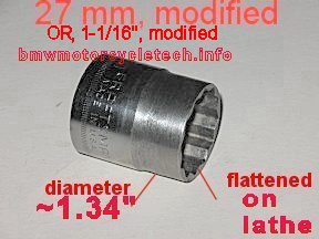 You can use a 27 mm or 1-1/16″ socket. The socket should be modified by making the end flat and square. Enough metal is removed so there is no taper left on the inside, as the 27 mm locknut is thin and you do not want to damage the nut by having the socket slip, which rounds the nut corners. Also modify the outside of the socket, and do this so that where it fits into the swing arm cavity the socket goes past any internal projections & then over the 27 mm nut completely & thoroughly and squarely. To explain this further, some Airhead motorcycles have a somewhat prominently seen/felt second circular “ridge” inside the swing arm cavity hole (its exact position may not be perfectly concentric, nor the diameter exactly the same for all motorcycles), so the socket must be ground on the outside. The very nicest way to modify the socket at both end and outside places is to chuck it in a three jaw chuck on a lathe & do the end & side of the socket near one end. The entire job can be done very neatly on a lathe in 5 minutes. The OUTSIDE diameter of the end of the socket can be done on any grinding wheel if you do not have access to a lathe, but the END must be done fairly precisely, so it is flat ….a belt sander will do if you are careful. You can also purchase one of these modified sockets from aftermarket BMW tools suppliers.