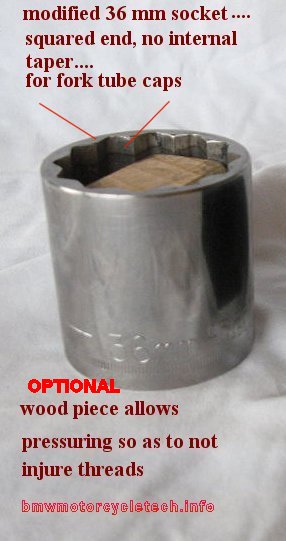 You can use a short socket, as above photo, for the front fork tubes’ caps, and with the wood piece as shown, the cap can be hand-pressured to help start the threads, so the threads are not injured when removing OR replacing the top cap. Snowbum uses the dogbone wrench on the top caps, for tightening and loosening; you can certainly use a socket, squared-off.