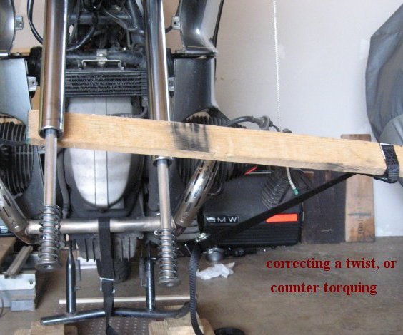 You will also see by example & photos what the very important reverse-torque method is, to avoid twisting your fork tubes. The illustrations of the anti-torque method are just one type. I have some photos that are not in that above article, regarding torque & anti-torque tools, & they are later in the article, below, that you are presently reading.
