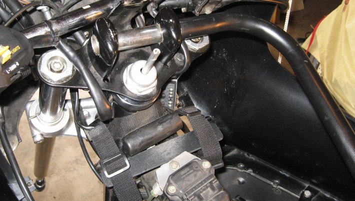 A piece of bent pipe that is being used to apply torque in one direction, with the top triple clamp in place.