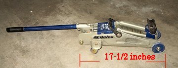 Above are two inexpensive ‘bottle jacks’. A 12 inch tall ‘carpenter’s square’ is in the center of the photograph, and a 12 inch ruler below to give you an idea of size. These two jacks happen to be the versatile types that have tops that screw-down into the jack pistons and those jack pistons are shown with jack pressure released, that is, down/collapsed.