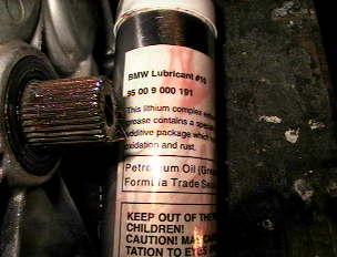 The gearbox is next, with nicely cleaned up splines on the input shaft (the part that goes into the clutch plate). Put the throwout rod back into the hollow input shaft, tapered end toward the clutch, with a bit (small bit) of antiseize on the end, with a bit of grease or gear oil on the shaft of the rod. Coat the splines with a thin layer of antiseize or BMW #10 grease (a do-every-20K task) and install the gear box in the reverse of the movement you used to take it out. Do pause part way into it and hook up the neutral wires to the switch on the bottom. The two bolts on the left and the long bolt with nut on the right reattach the box to the engine block.