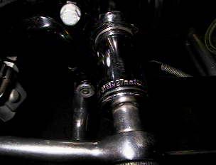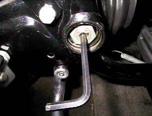 Take out pin that rear brake pivots on and allow foot brake lever and rod to drop down. Use ground down 27mm or 1 1/16″ socket to loosen lock nuts on swingarm pivots. Use 6mm allen to take out pivot pins.