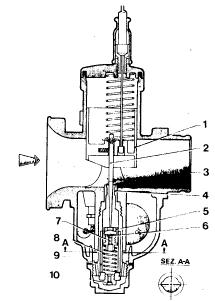 As shown in the figure, on opening the throttle (1), the tapered-needle (2) integral with it, releases the piston (5) with its perforated top, which rises, pushed by the spring (8), squirting fuel through the atomizer (4) directly into the main barrel (3). In the upstroke, the ball-bearing valve (6) closes and seals the hole (7).