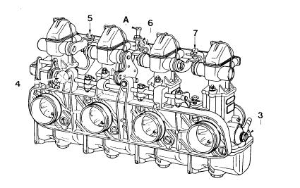 The throttle valve opening securing-screw (A) should be adjusted is such a way that it allows full opening of the throttle slides up to a maximum of 1mm beyond complete clearance of each carburetor barrel.