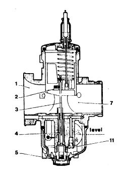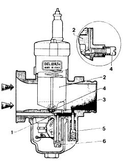On closing the throttle, the diaphragm returns to its original position, pushed by the spring and drawing fuel up from float chamber through the inlet valve (6).